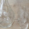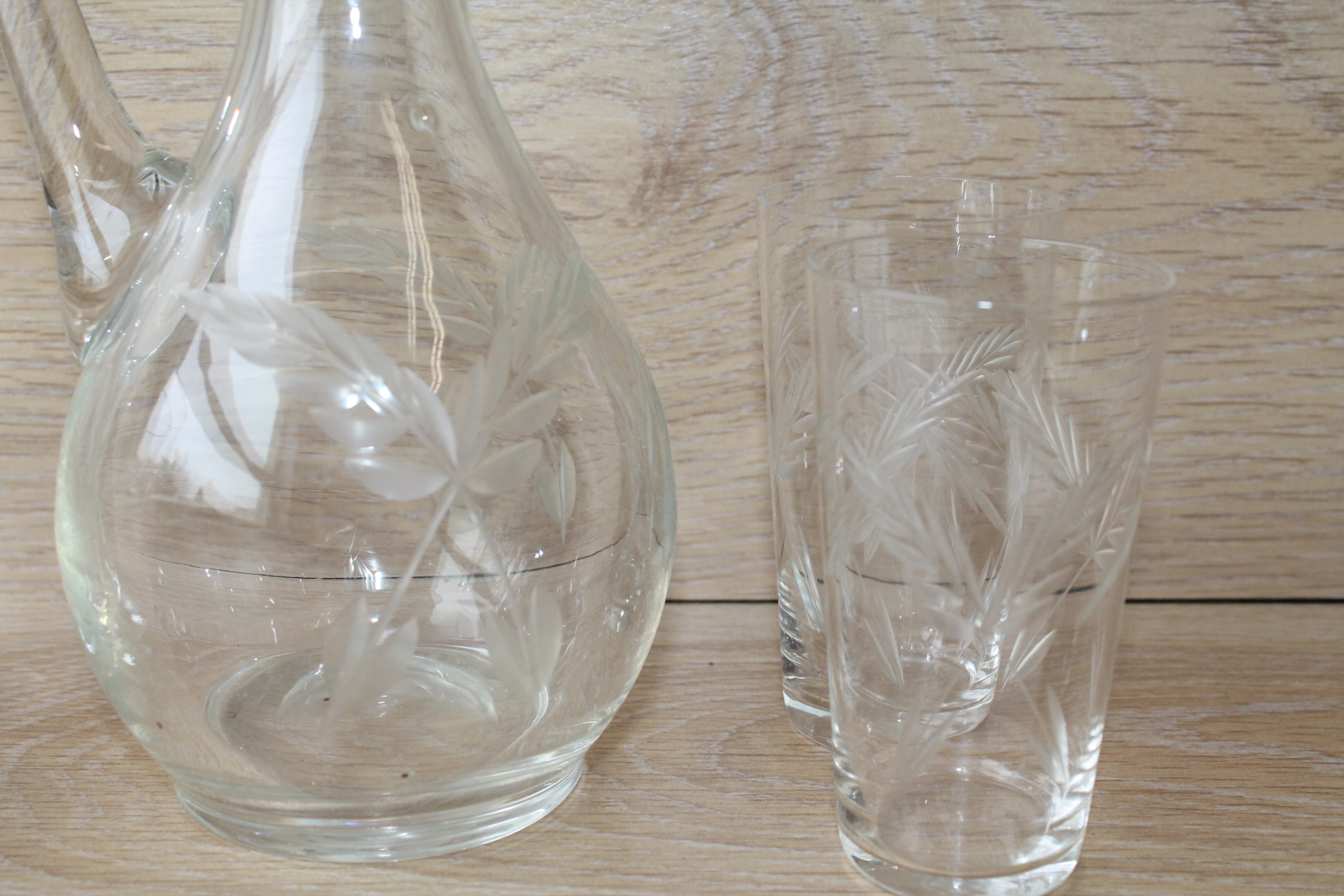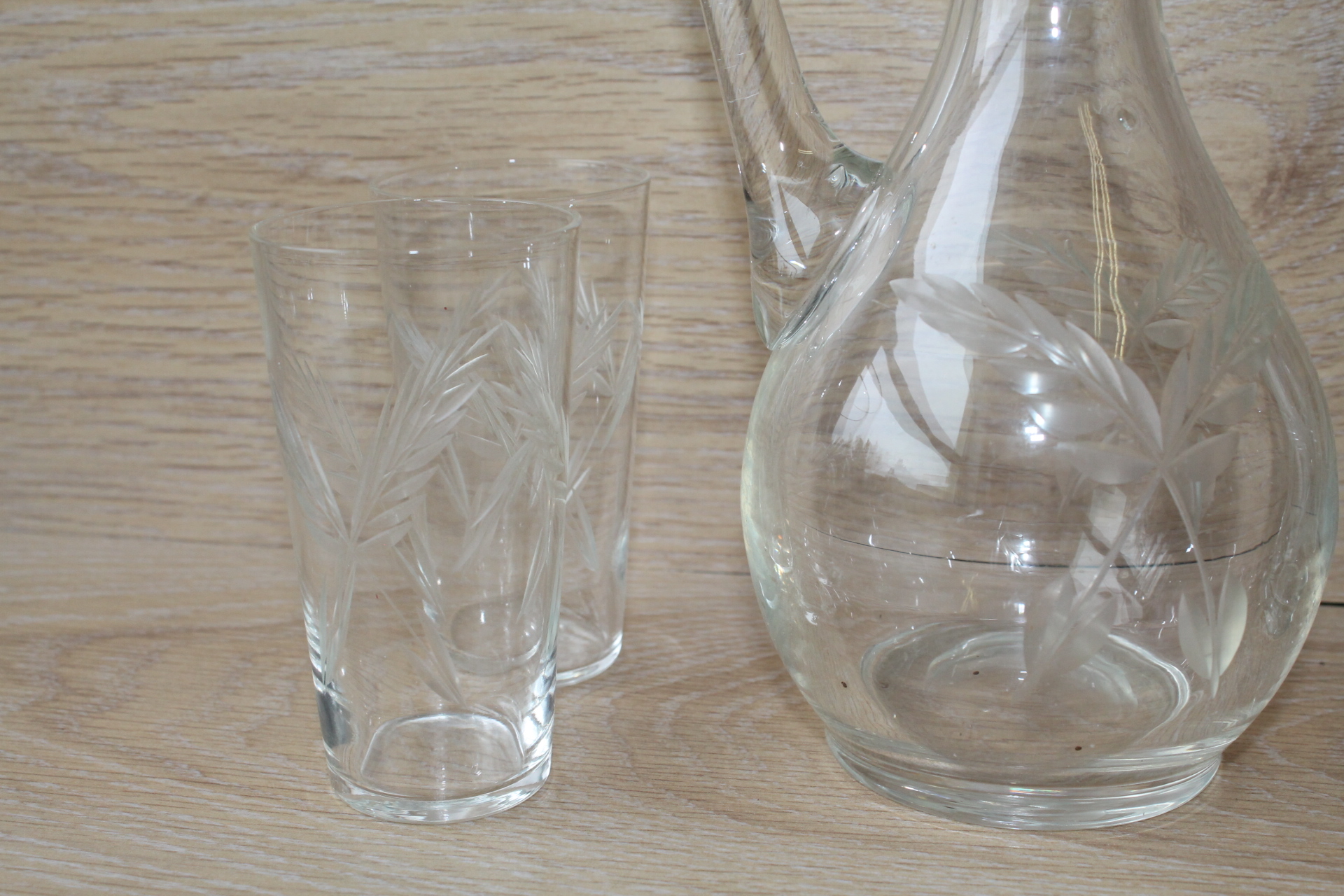 Kann K 29 cm, klaasid k 9 cm. 3 klaasi põhjas täkked.